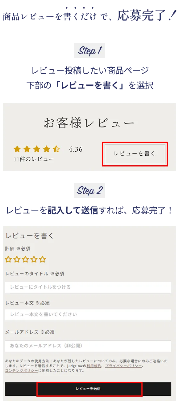 - レビューの投稿には、メールアドレスのご入力が必要です(※メールアドレスは公開されません)。当選された方には、ご記載いただいたメールアドレス宛にご連絡いたしますので、入力内容にお間違いがないようご注意ください。