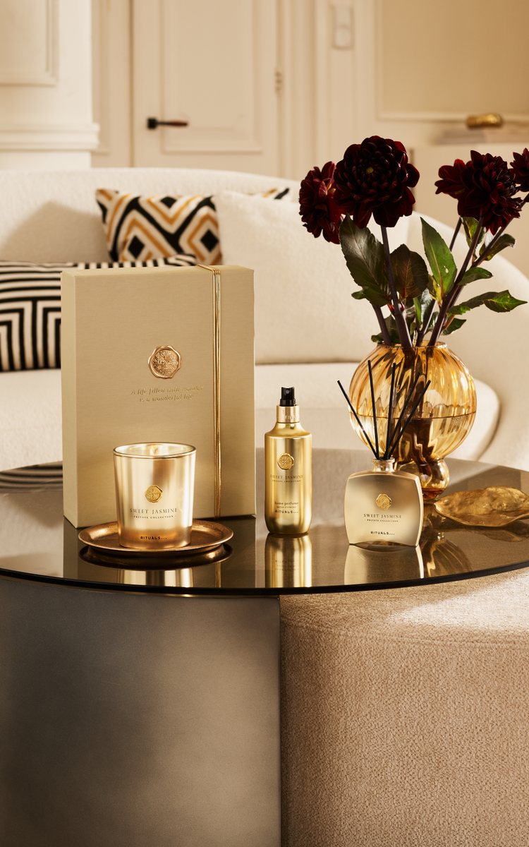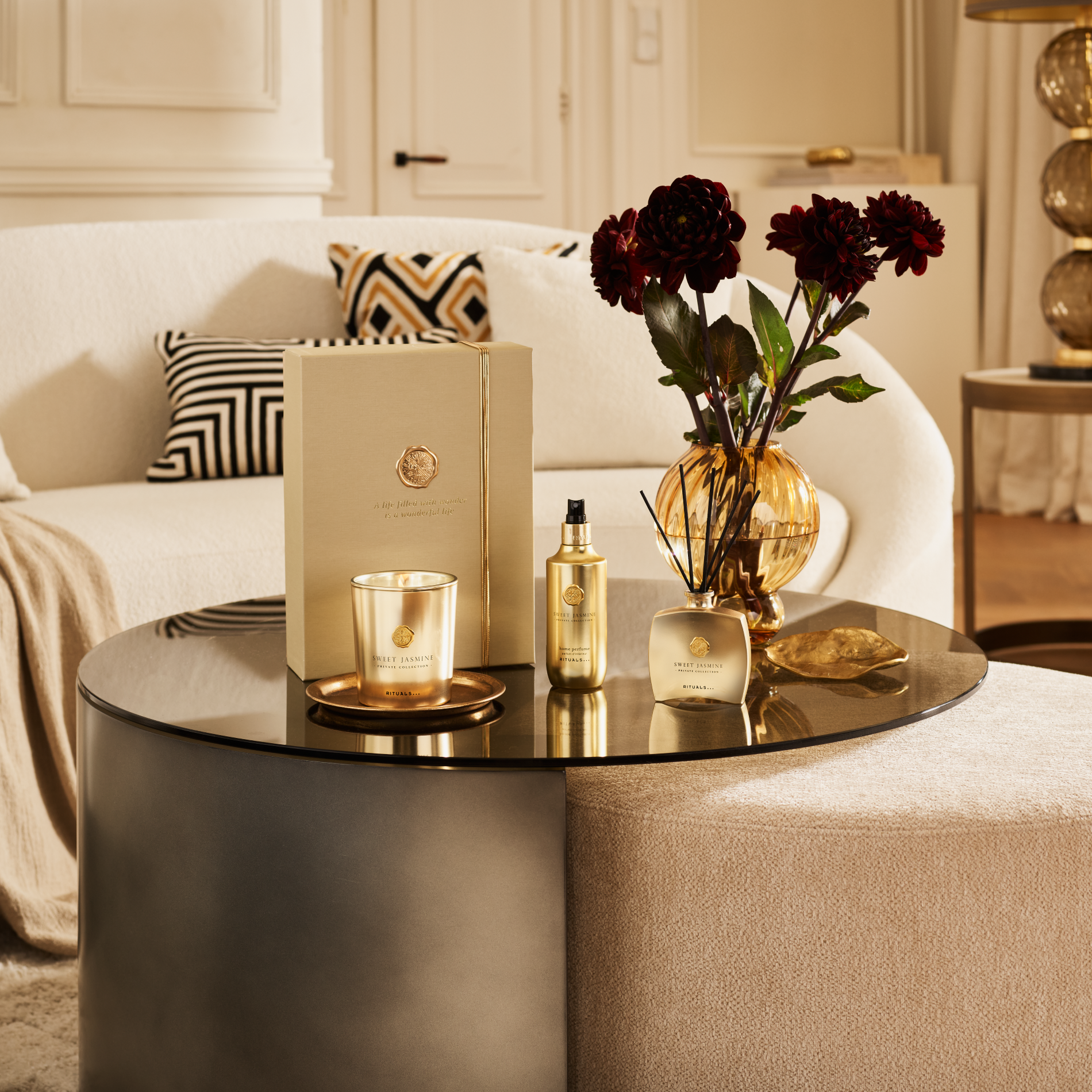 友人や家族へのプレゼントにも、自分へのご褒美にもぴったりの魅力的なスイート ジャスミン ギフトセット。アロマキャンドル、ミニ フレグランス スティック、ホーム パフュームがセットになっています。爽やかなシトラスとベリーのフルーティで生き生きと輝くようなトップノートに続いて、ピオニーとスズランを思わせるエレガントな花々の香りが重なり、サンダルウッドがエレガントでぬくもりある余韻を残します。使用済みのギフトボックスは、写真や手紙、小物などの収納にもお使いいただけます。 リチュアルズ公式オンラインストアでご覧ください。