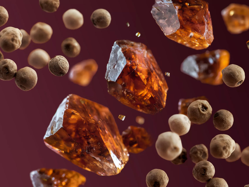 アンバーとは樹脂が化石化したもので、その色と自然が作り出す美しさは新石器時代から珍重されてきました。フレグランスに使用されるアンバーアコードは、甘く柔らかなセンシュアルな香りと、バニラを思わせるパウダリーでオリエンタルなアクセントが特徴です。