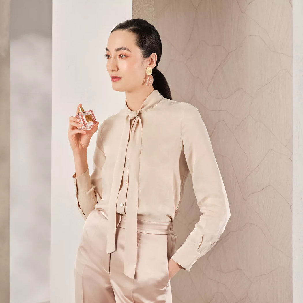 耳の後ろや手首、ひじの内側、のど元など、脈を打つ箇所にさっとひと吹きして軽くたたきます。その後フレグランスを自然乾燥させてください。香りが変化するため、こすらないでください。